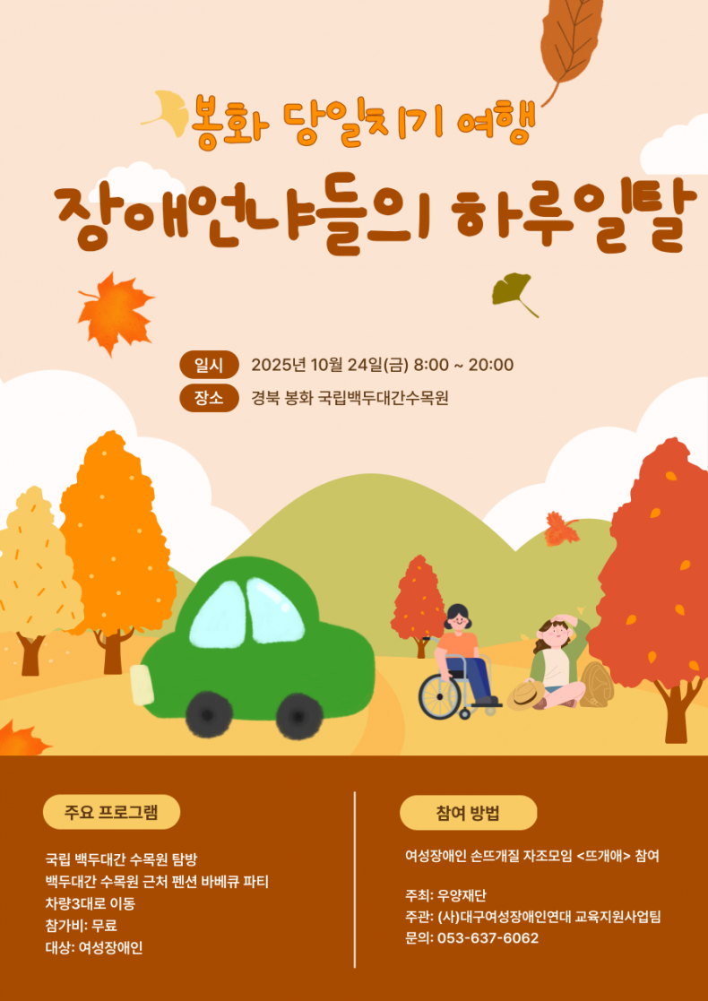 이렇게 홍보 포스터까지 만들었었지만, 배포할 찰나도 필요없이, 모든 신청인원이 마감되어버렷었습니다. 뜨개애 자조모임 회원님들을 중심으로 총 13명의 인원이 3대의 차로 나누어 타고 즐겁고 행복한 여행 안전하게 마무리하였습니다. 박미옥 회원님께서 개인 차량을 제공해주시고 운전까지 직접 맡아 주셨습니다. 김정화 회원님은 봉화의 세컨 하우스를 개방하여 바베큐 파티를 가능하게 해주셨지요. 우양재단의 지원금으로 정말 즐겁고 신나고 행복한 가을여행의 추억 한가득 쌓았습니다. 내년에는 다른 분들에게도 기회가 갈 수 있도록 새롭게 공모에 도전해보도록 하겠습니다.