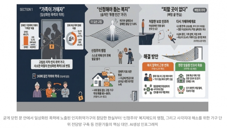 <심층분석> 지적장애 등 구성원 결합 '인지취약가구’…사회복지 사각지대에 고립 사회안전망·복지에서 가장 위태로운 고위험군 고립 속 일상화된 폭력과 착취 ![]() 인지능력이 부족해 스스로 도움을 청하지 못하는 ‘인지취약가구’는 사회복지 사각지대 중에서도 가장 깊고 어두운 곳에 고립돼 있다. 국가 사회복지 시스템의 발달에도 불구하고, 여전히 우리 주변에는 사회안전망의 그물에 포착되지 않은 채 힘겨운 하루하루를 버티는 가구들이 존재한다. 그 중에서도 특히 인지능력이 낮아 스스로를 보호하거나 지원을 요청하는 데 어려움을 겪는 ‘인지취약가구(지적장애 의심 등 다장애 의심가구 포함)’는 복지 사각지대 중에서도 가장 깊고 어두운 곳에 놓여 있다. 전국적으로 충격을 가져온 ‘신천 캐리어 사건’도 이러한 범주라고 볼 수 있다. 본보는 학계 및 현장 전문가들의 분석과 구체적인 통계를 통해, 이들이 겪는 고립과 붕괴의 실태를 파헤치고 제도적 개선방안을 모색해 봤다. ◆ "가족이 가해자"… 고립 속 일상화된 폭력과 착취 인지능력이 부족한 구성원들로만 이뤄진 가구는 우리 사회에서 가장 위태로운 고위험군이다. 이동석 대구대학교 사회복지학과 겸 대학원 장애학과 교수는 이런 가구가 겪는 핵심 위기로 '사회적 고립'을 지목했다. 이 교수는 “일반 가구는 마찰이 생겨도 사회생활을 하며 감정을 식히는 ‘쿨링(cooling) 효과’가 존재하지만, 고립된 지적·인지 취약가구는 사소한 마찰이 쉽게 폭력으로 번지고 저항할 힘이 없는 피해자가 이를 감내하며 폭력이 만성화된다"고 진단했다. 전국여성장애인폭력피해지원상담소 및 보호시설협의회(전여상보협)의 최근 3년(2022~2024년)간 통계는 이 고립된 밀실의 참혹함을 명백히 증명한다. 장애인 가정폭력은 부모나 자녀 등 '가족원'이 가해자인 비율이 49.2%로, 비장애인(3.3%)보다 8배나 높았다. 비장애인은 정서적 폭력이 신체적 폭력보다 5배 가량 많지만, 장애 여성은 정서적 학대(47.7%)와 신체적 폭력(41.0%) 비율이 엇비슷해 심각한 물리적 폭력에 일상적으로 노출된 것으로 나타났다. 안순애 대구여성장애인통합상담소 상담팀장은 “최근 미등록 장애 추정 어머니와 지적장애 미혼모 딸, 손녀가 함께 사는 가구를 지원했다”며 “그런데 어머니가 딸의 수급비를 착취하고, 그 스트레스로 딸은 다시 아이를 학대하는 등 3대에 걸친 폭력이 발견되기도 했다”며 참담한 실태를 전했다. ◆ "신청해야 돕는 복지"… 철저히 숨겨진 '투명인간' 가구 이런 참담한 비극이 밖으로 드러나지 않는 근본 원인은 다장애 의심 가구를 발굴해 내지 못하는 현행 제도의 맹점에 있다. 본인이 직접 신청해야 돕는 ‘신청주의’ 제도로는 스스로 피해를 인지하지 못하는 이들을 구해낼 수가 없다. 여성가족부의 2022년 가정폭력 실태조사 응답자 중 장애인은 단 1.6%에 불과할 정도로 공식 행정망에서조차 소외된 것이 현실이다. 단전·단수 등 경제적 지표에만 의존하는 발굴 시스템도 한계가 뚜렷하다. 이동석 교수는 “기초생활수급비나 장애인 연금을 받아 공과금만 내면 행정망의 위기 데이터에는 잡히지 않는다”며 “사회활동 없이 집에만 고립돼 있다면, 학대가 발생할 확률이 80~90%에 달한다”고 경고했다. ◆ 놓쳐버린 징후와 착취의 늪…법적 개입의 한계 어렵게 위험 징후가 포착되더라도 턱없이 부족한 법적 권한이 구조의 골든타임을 번번이 놓치게 만든다. 인지취약가구 구성원의 ‘가출’은 특히 위험한 신호다. 이 교수는 “인지취약가구의 가출은 가장 강력한 ‘위험 징후’임에도, 치안 현장에서는 단순 해프닝으로 끝내는 경우가 많다”며 “치안망에 징후가 포착됐을 때 즉시 전문기관으로 연계하도록 매뉴얼을 고쳐야 한다”고 지적했다. 치안과 복지망이 단절된 사이 집을 나선 장애 여성들은 외부의 끔찍한 착취로 내몰린다. 이주영 대구여성장애인통합상담소장은 “가출한 장애여성의 취약성을 이용해 접근하는 가해자에게 ‘그루밍(길들이기)’에 의한 성착취 피해를 입은 내담자들을 흔히 마주한다”고 전했다. 더 뼈아픈 것은 제도의 무력함이다. 이 소장은“가해자가 장애가 있는 피해자를 통제상태에 두고 외부와의 소통을 차단한다면 이 상황을무력화할 방법이 없다. 착취적 관계가 의심된다고 하더라도 성인인 장애인 피해자가 개입을 원하지 않는다고 하면 공권력도, 상담소도 더 이상 진실에 다가가지 못하고 돌아서야만 하는 답답한 한계가 존재한다“고 토로했다. ◆“피할 곳이 없다”…다시 가해자에게 돌아가는 현실 설령 고립의 문을 열고, 피해자를 구출해 내더라도 이들을 보호할 인프라는 처참한 수준이다. 이주영 소장은 “당장 폭력을 피해 몸을 숨길 수 있는 여성장애인 전용 쉼터는 전국에 단 2곳뿐”이라고 지적했다. 전여상보협의 최근 3년(2022~2024년)간 통계에 따르면, 어렵게 비장애인 중심의 보호시설에 입소해도 낯선 공동생활과 투약 관리의 어려움 등 시스템의 한계 탓에 절반 이상(50.9%)이 적응하지 못하고 중도에 퇴소한다. 더욱 뼈아픈 점은 기초생활수급비 중단, 가족의 돌봄 압박, 자립 인프라 부족 등에 