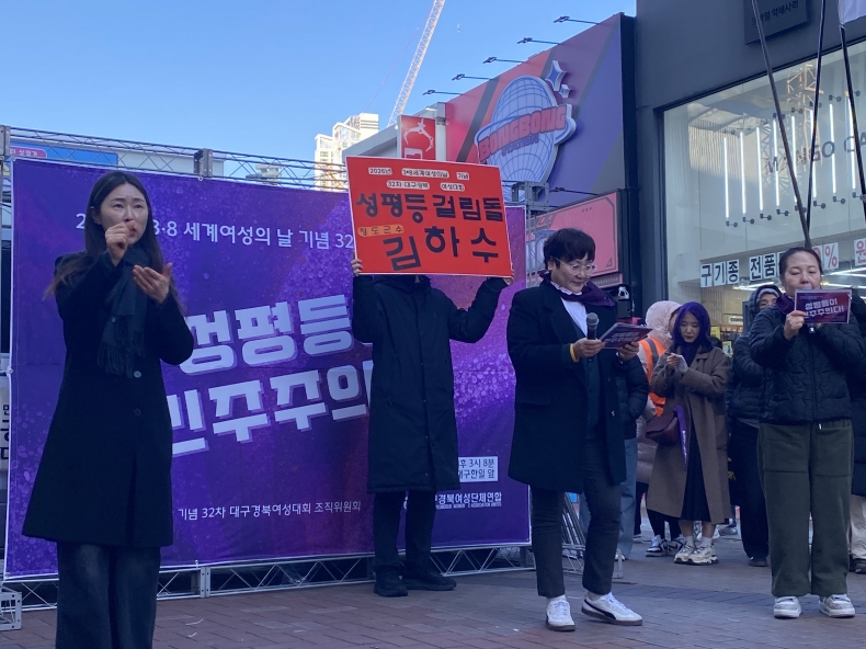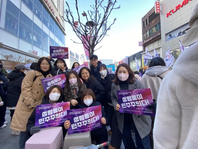 어김없이 올해에도 3월 8일 세계여성날을 맞아 대구경북여성대회가 열렸습니다 송경인 대구경북여성단체연합 상임대표님의 대회사를 시작으로 연대사. 당사자발언, 성평등 디딤돌, 걸림동 시상과 여성선언문 낭독으로 본식을 마치고 대구 시가지를 도는 행진으로 마무리 되었습니다.